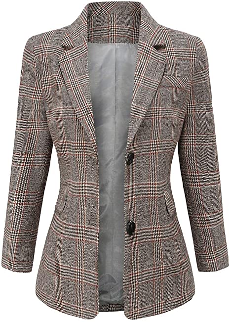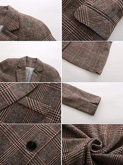 Design: Notched lapel collar, flap pockets, long sleeves, plaid pattern, fully lined blazer coat.